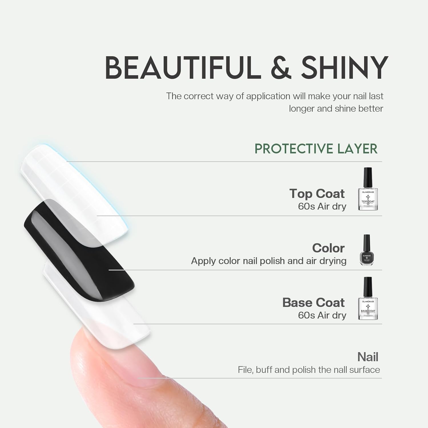 Natural Ingredients & High Compatibility: Shiny top coat nail polish for Natural Nail made of natural resins and ingredients,non-toxic,non-yellowing. Base and top coat nail polish erfectly compatible with any type of nail polish.But will not change the original color of nail polish. Patented formula keeps your nails, No Fade No Chip and No Peel. Clear top coat nail polish no pungent smell,suitable for beginners and nail polish top coat lovers at home DIY.