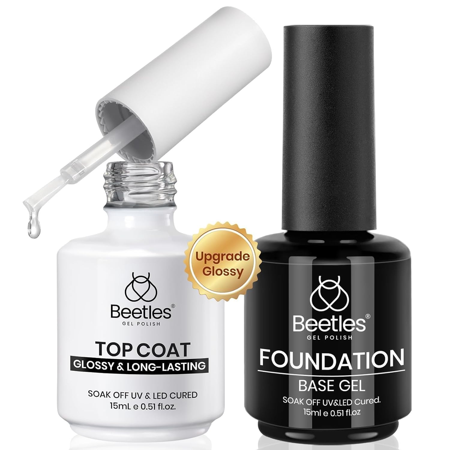 Beetles Gel Top and Base Coat: This basic functional gel set contains 15 ml base coat*1, 15 ml upgrade super shiny no wipe gel top coat*1. Tips: It is normal for the base gel to be a little tacky after curing. The base coat gel can provide a solid base for the next layer of top coat. (Note: base gel cannot be used as a glue)