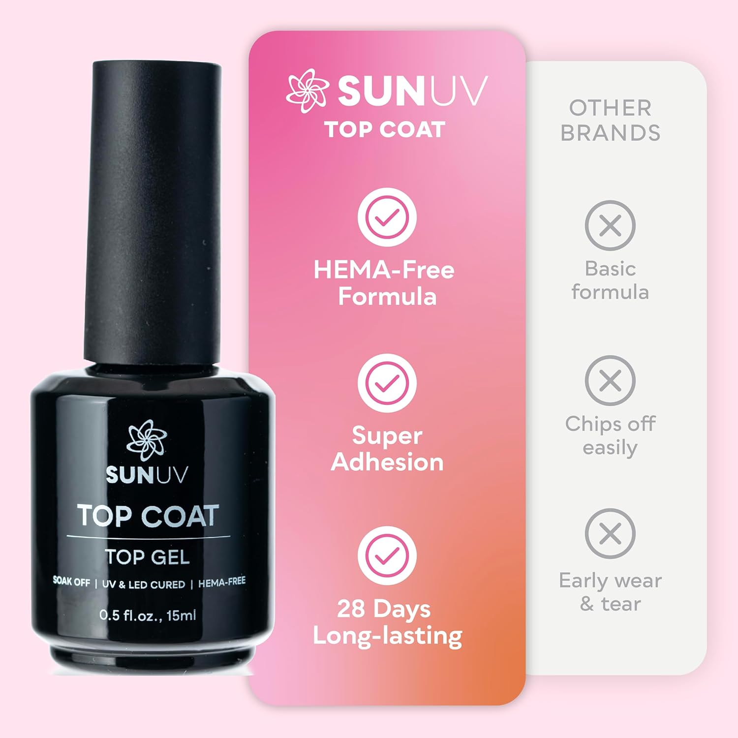 SUNUV No Wipe Gel Nail Polish: 2 Pcs 15ml bottles high glossy no wipe top coat and base coat hema free